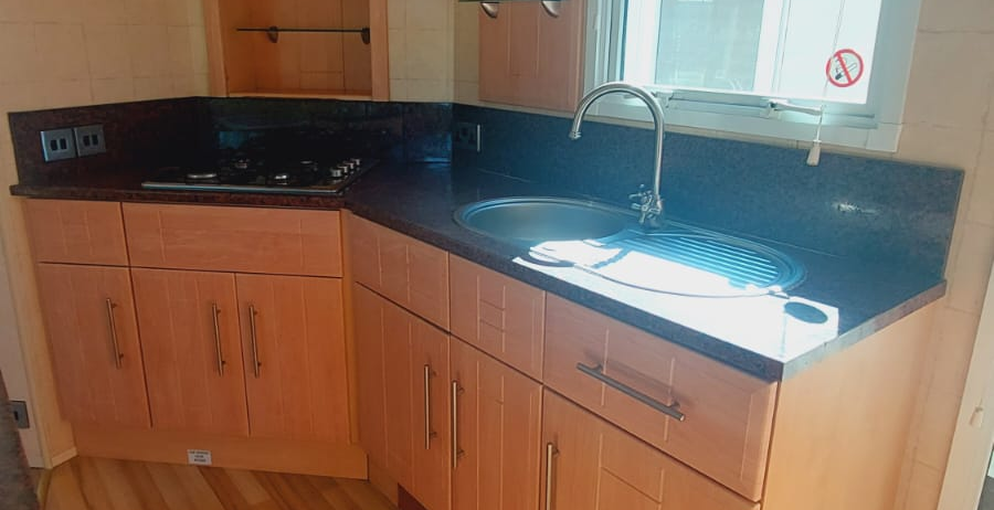 -kuchni z meblami, kuchenką gazową piekarnikiem, jednokomorowym zlewem.