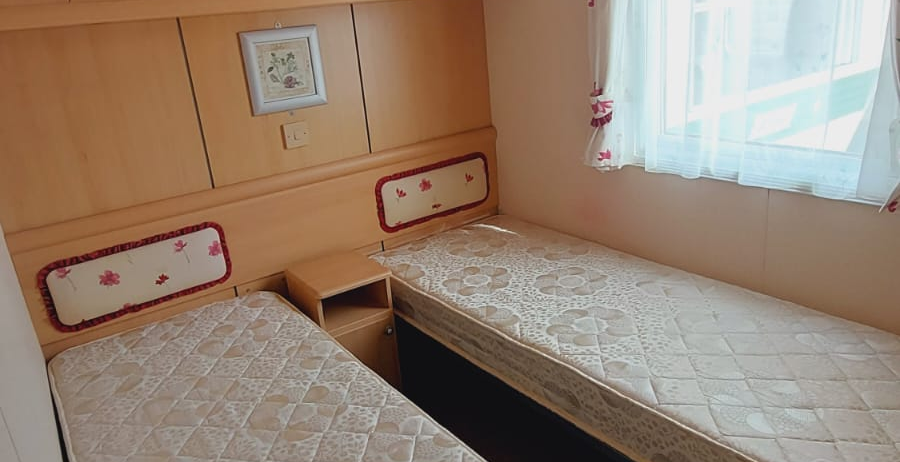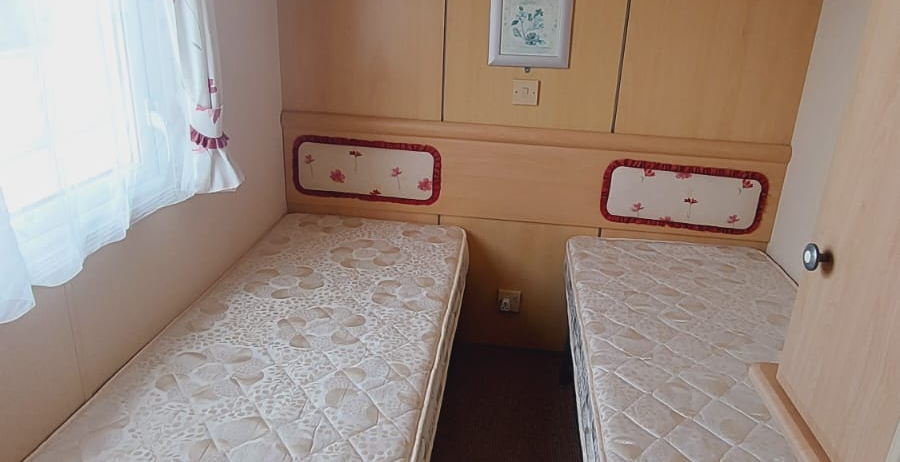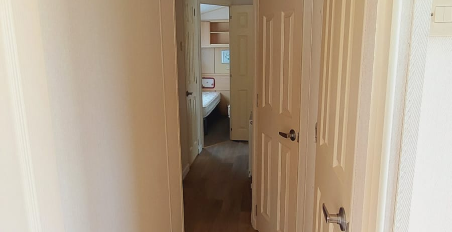 Posiada dwie sypialnie, jedną parę drzwi wejściowych.